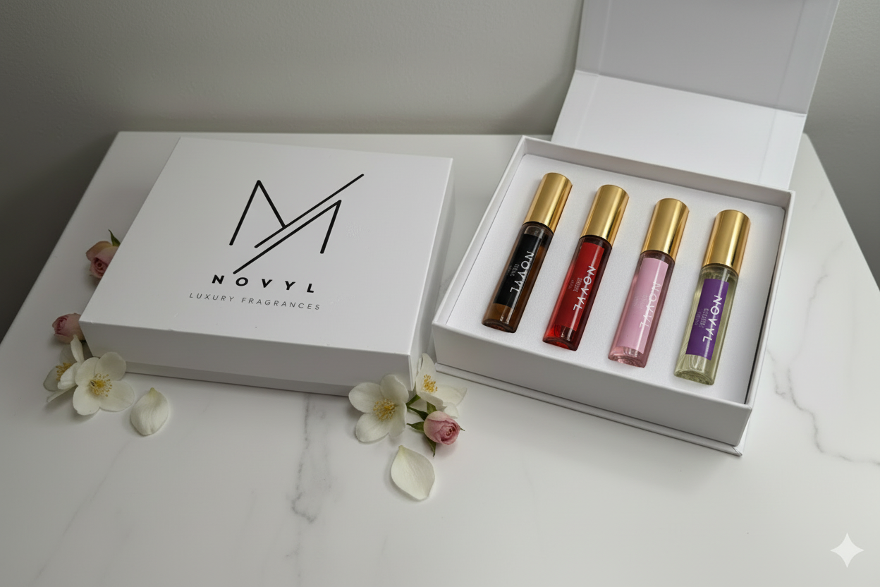 - Sets include Chill, Energy, Rare, Sophisticated, Bliss, and Novyl No.1 in 10ml travel spray.